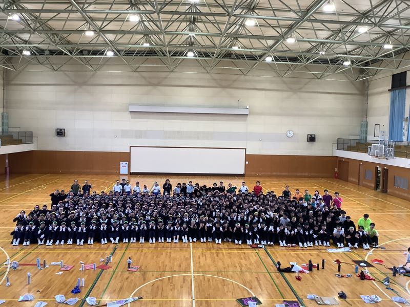 やり切った充実感。みんなの笑顔。応援合戦が終わった後、クラスの集合写真、そして学年集合写真を撮りました。 担任の先生もクラスカラーのポロシャツを着て、「ハイ、ポーズ」です。