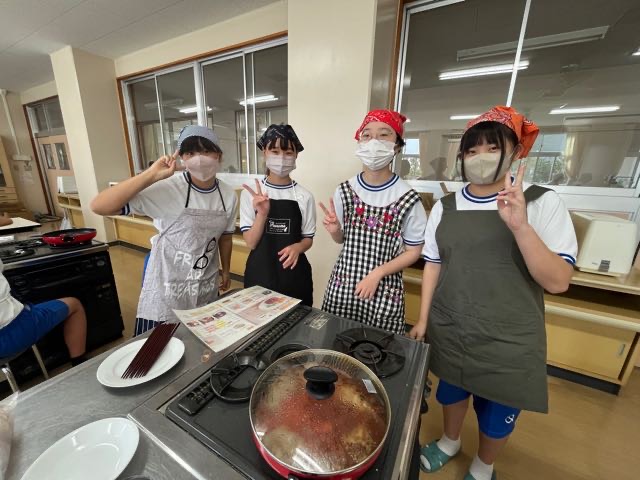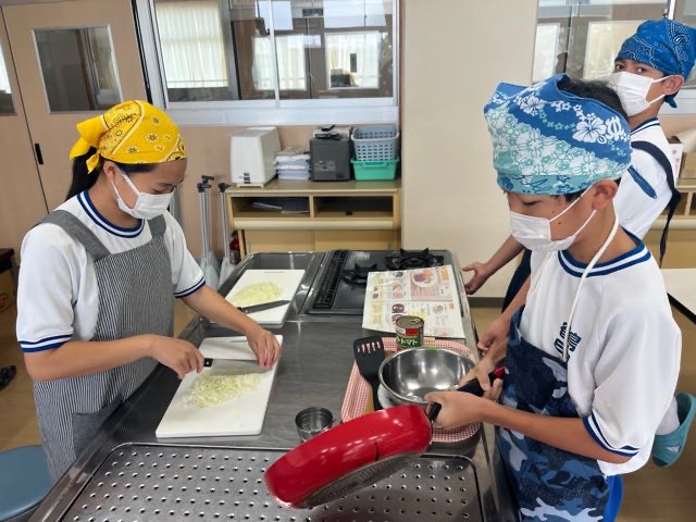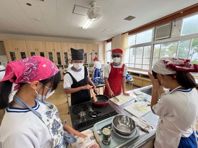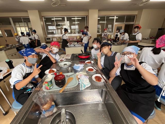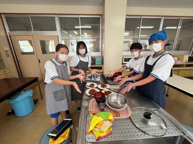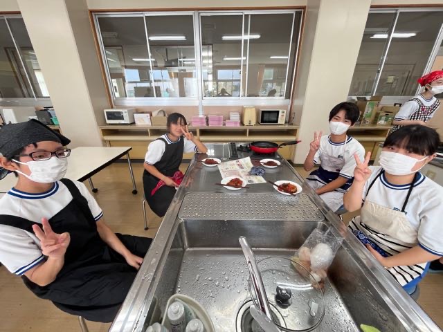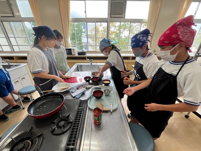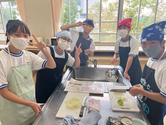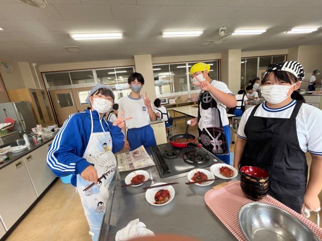 2年5組の調理実習の様子です。投稿が遅くなってしまい、5組のみなさんごめんなさい。 玉ねぎを切って涙が出ないように対策?をしてきてくれたりとやる気いっぱいの5組です!美味しいハンバーグが完成しました。