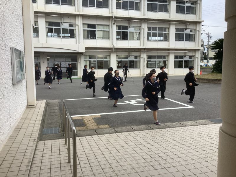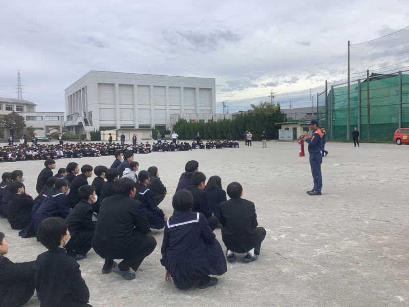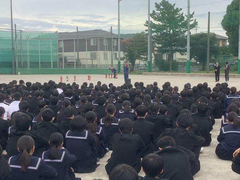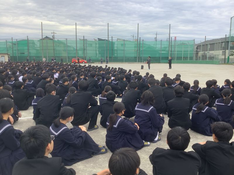 火災の避難訓練を行いました。この訓練は、事前に生徒には知らせずに、急に火災が起きたという想定です。 鶴城中学校は、1000人を越える生徒がいます。今回、5分以内で、全校生徒が避難でき、消防署の方からもお褒めの言葉をいただきました。