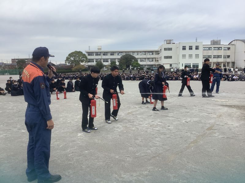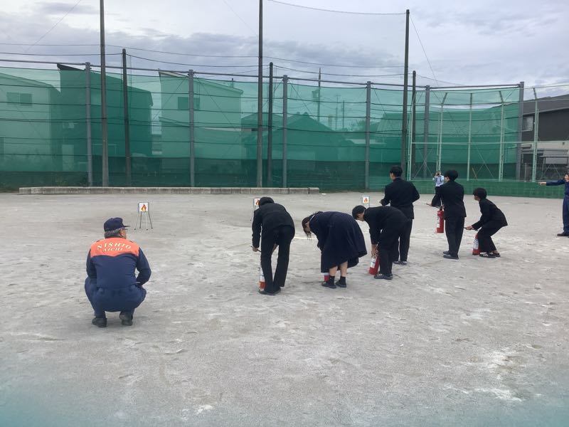 全員避難した後、消火器の放水訓練を各クラスの代表が行いました。