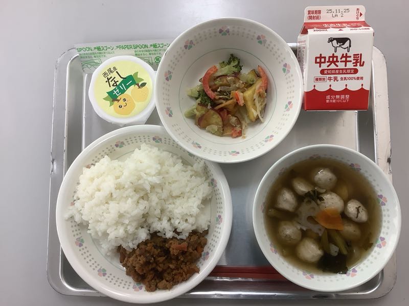 今日のメニューは、ご飯、牛乳、にしおの肉みそ、さつまいものサラダ、れんこんとつみれのすまし汁、西尾産梨ゼリーです。(766kcal)
