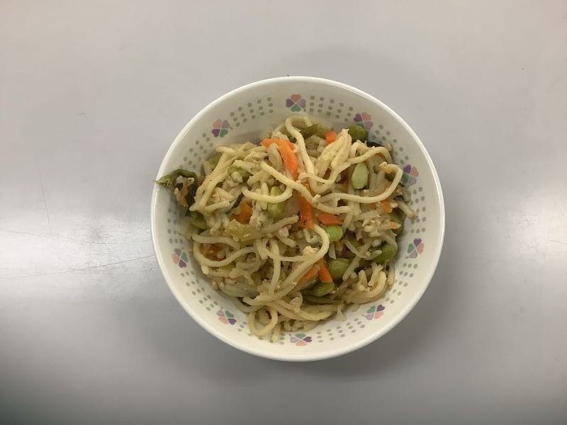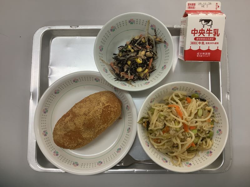 今日のメニューは、枝豆のパスタ、牛乳、きな粉揚げパン、ひじきのサラダです。(753kcal)