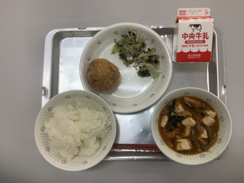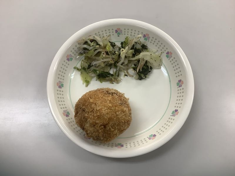 鶴中で提供するコロッケはほとんどが手作りです。1000食の規模でも調理員さんは生徒たちのためにと一生懸命手作りをしてくださいます。この手作りコロッケですが、中身がいつも違うことに気がついていますか?コロッケの中身はその時期の食材を使ったりして少しずつバリエーションを変えています。