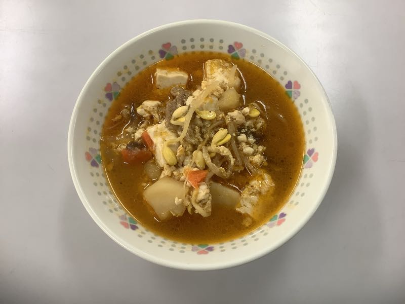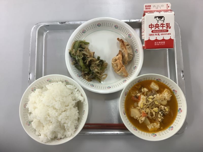 今日のメニューは、ご飯、牛乳、焼きぎょうざ2個、ツナと野菜のさっぱりサラダ、ユッケジャンスープです。(751kcal)