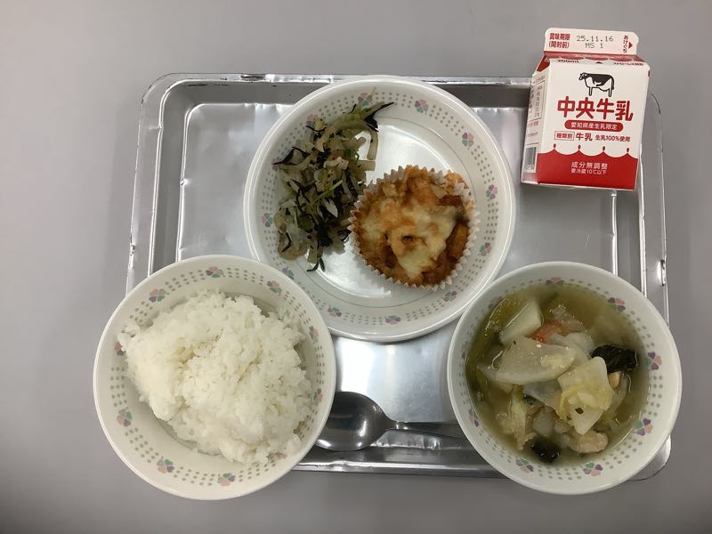 今日のメニューは、ご飯、牛乳、手作り厚揚げの和風グラタン、しそひじきあえ、チキンとじゃがいものポトフです。(748kcal)