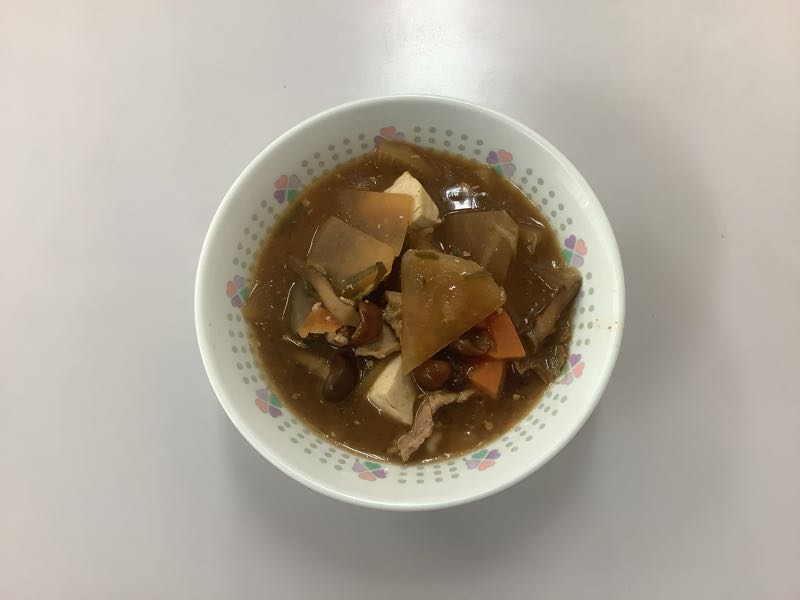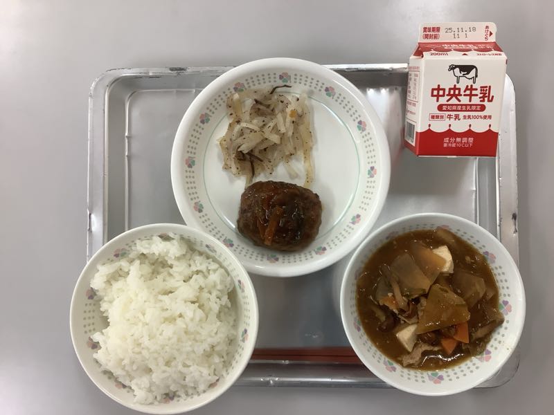 今日のメニューは、ご飯、牛乳、ハンバーグの野菜あんかけ、大根のしそ昆布あえ、なめこの豚汁です。(749kcal)