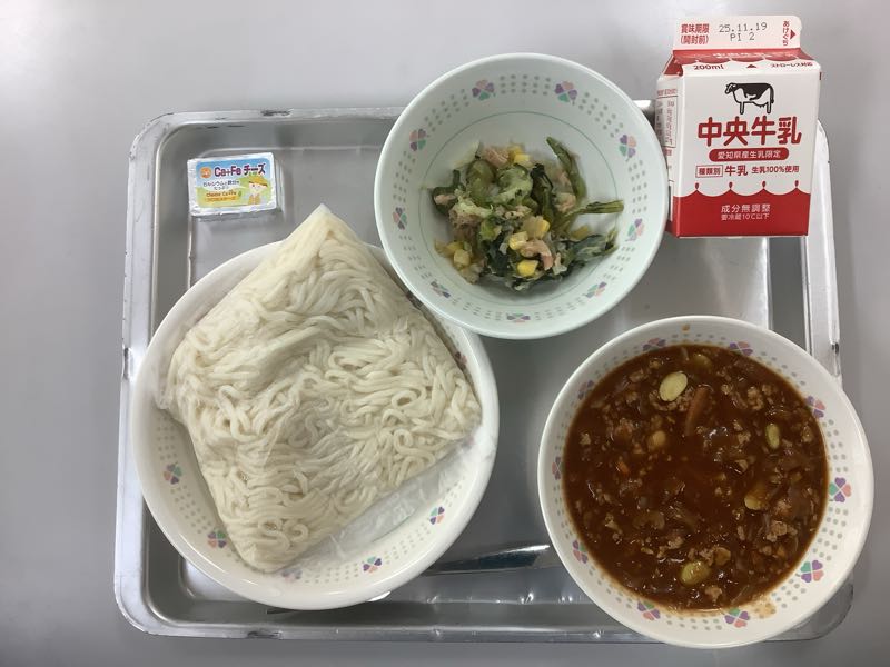 今日のメニューは、ソフト麺、牛乳、ビーンズソース、ツナレモンサラダ、チーズです。(825kcal)