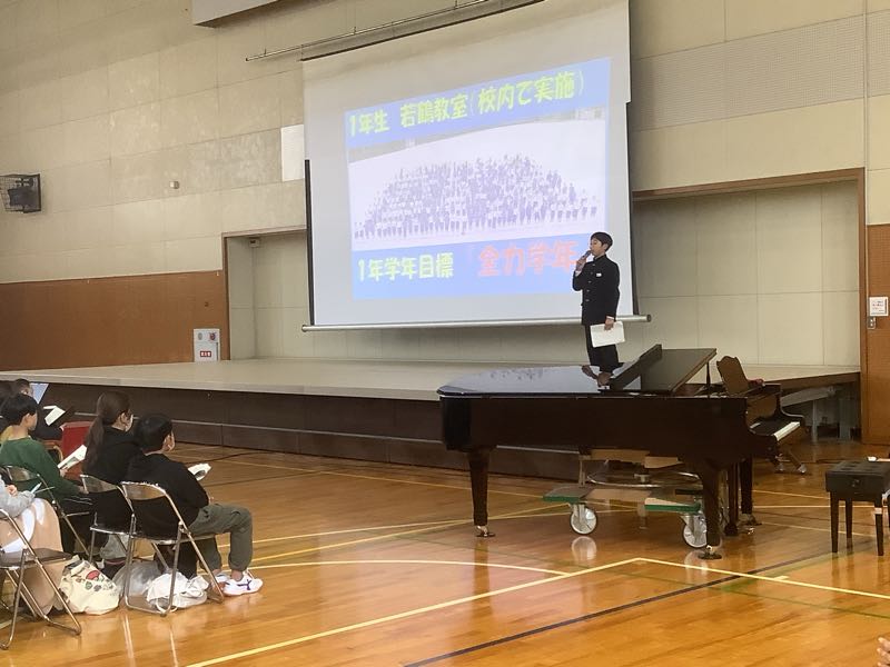 校長先生の話の後、学習、生活、部活動、安全、健康について、現在の1年生がステージに立ち、わかりやすく説明を行いました。