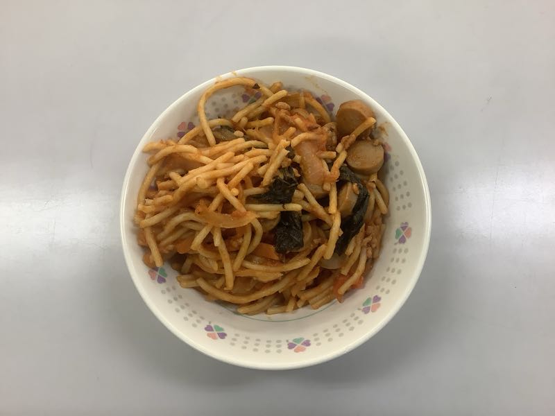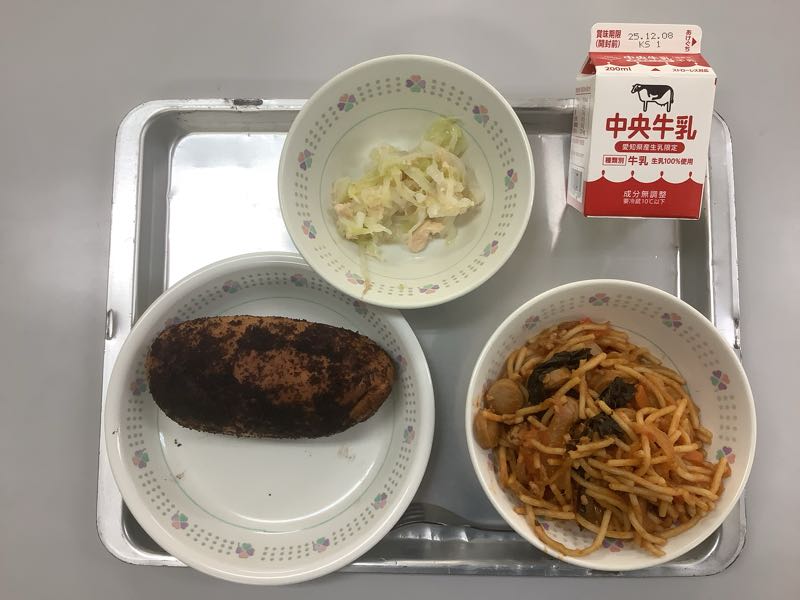 今日のメニューは、イタリアンスパゲッティ、牛乳、ココア揚げパン、大根のさっぱりサラダです。(764kcal)