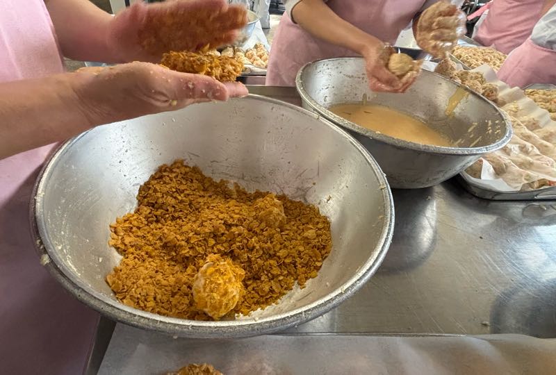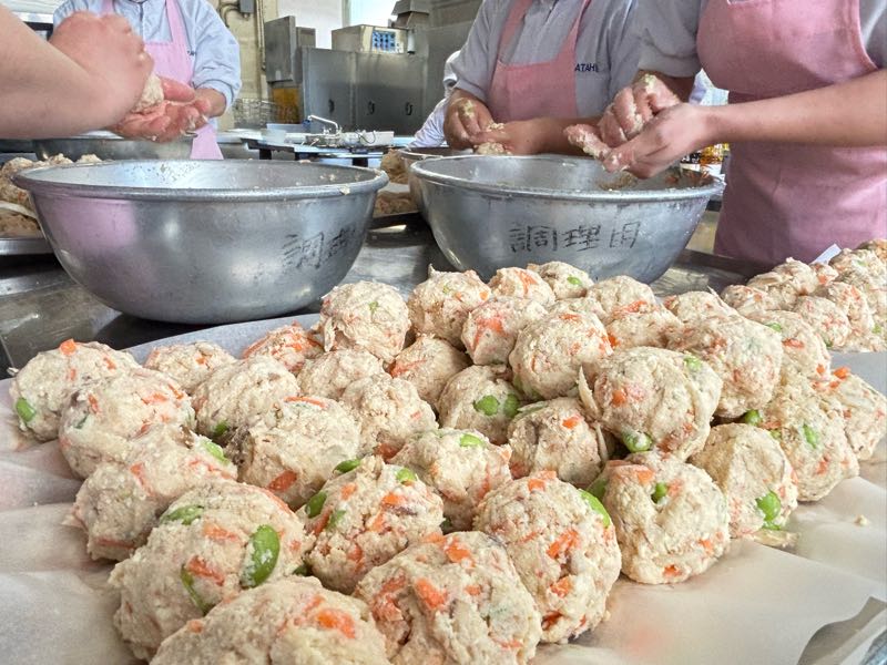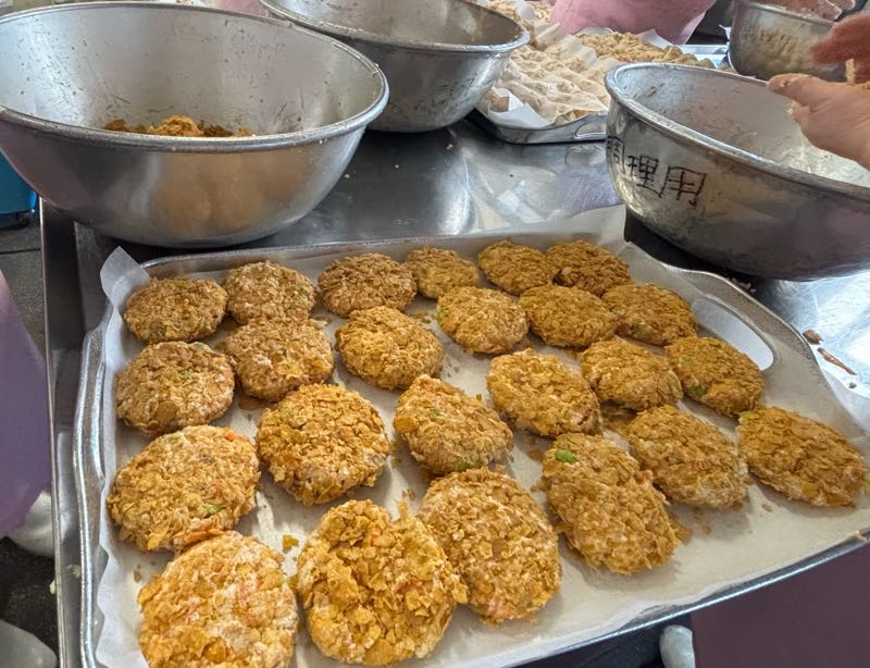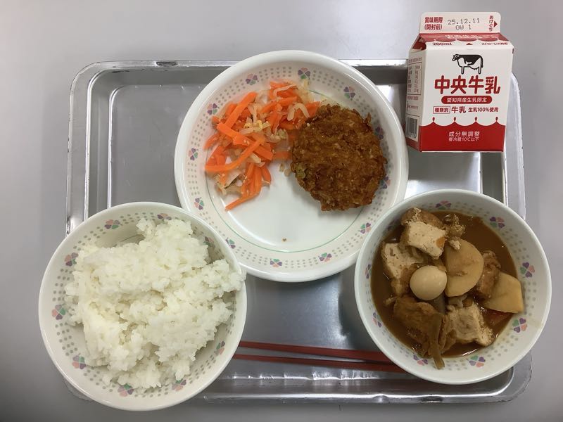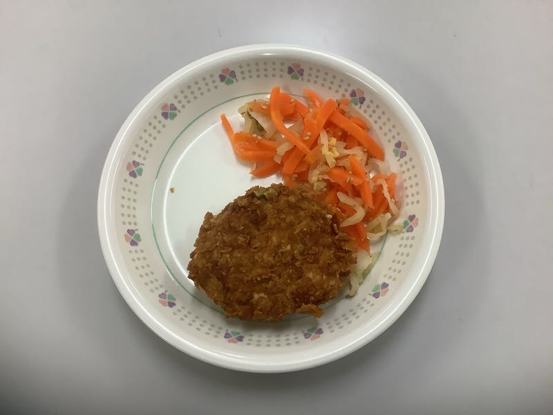 がんもどきは、崩して水分を切った豆腐に、にんじんなどの野菜を混ぜて油で揚げたものです。今日のがんもどきは、給食室で手作りしました。コーンフレークなどを混ぜて揚げることで、ザクザクとした食感にして食べやすく工夫してあります。