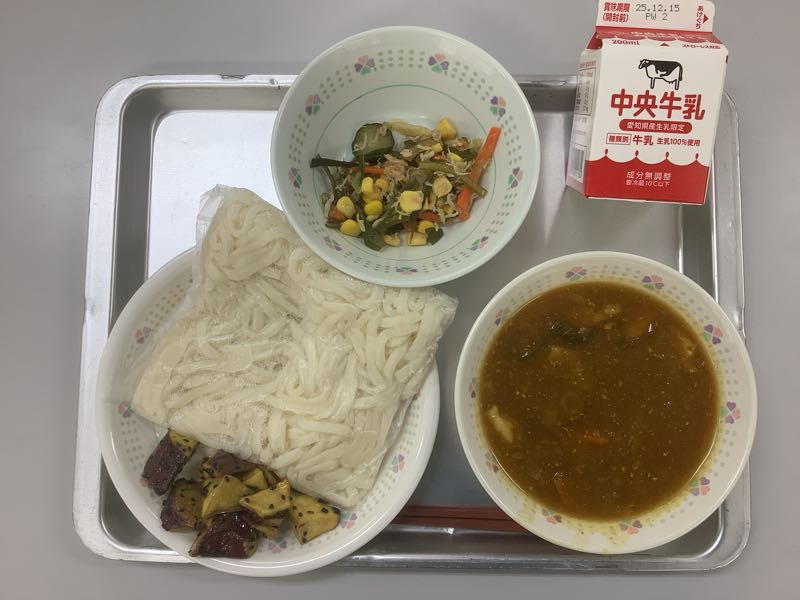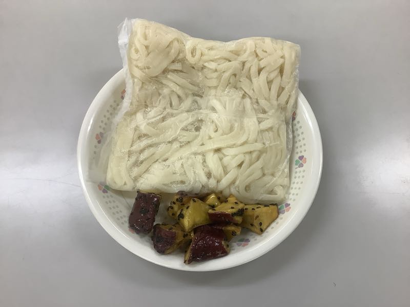 今日のメニューは、白玉うどん、牛乳、カレー南蛮、しらす入り海藻サラダ、手作り大学いもです。(806kcal)