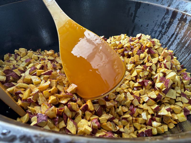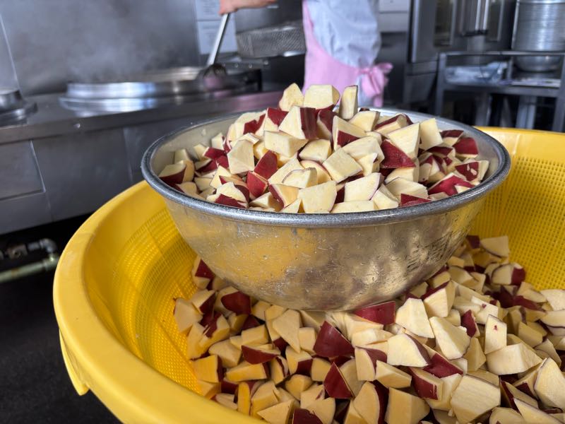 大学いもに使われている「さつまいも」は、調理員さんの手切りでちょうどよい大きさに切って使用しています。 今日は60キロ以上のさつまいもが朝から調理室に届き、調理員さんは朝早くから作業してくださいました。さつまいもは、火を通すと甘みが増しておいしいです。子どもたちは、味わって食べたでしょうか。