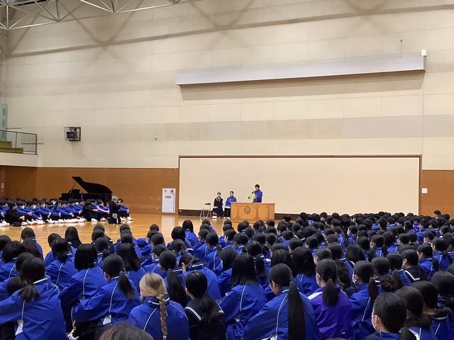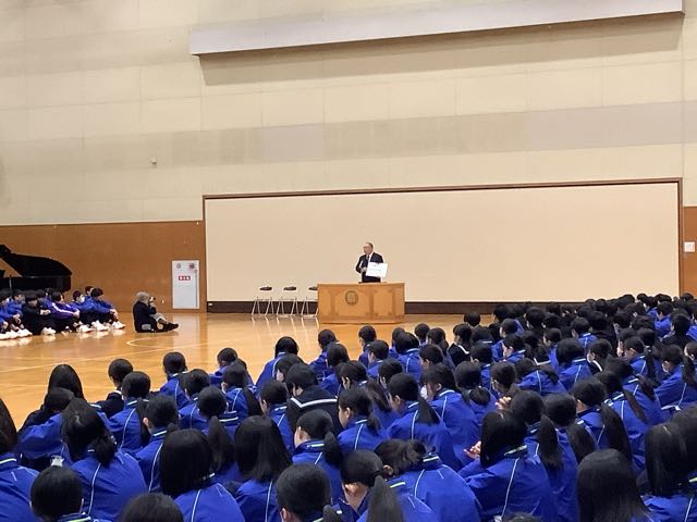 新春の冷たい空気にも負けず、鶴中生が元気に登校し、三学期の始業式が行われました。