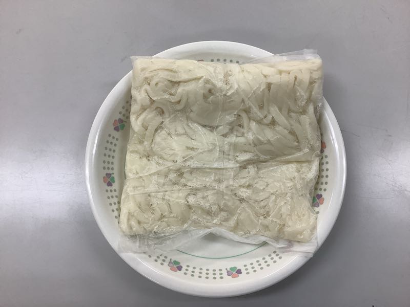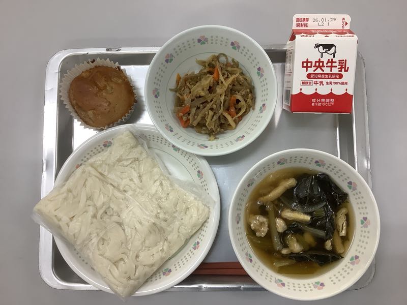 今日のメニューは、西尾の小麦白玉うどん、牛乳、五目汁、根菜きんぴら、手作りさつまいもケーキです。(750kcal)
