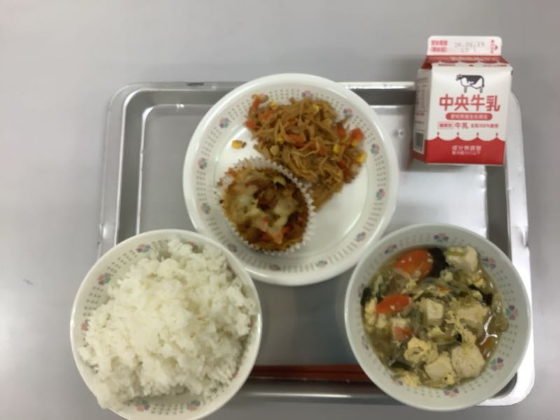 今日のメニューは、ご飯、牛乳、チーズタッカルビ、切干し大根のチャプチェ、卵入りわかめスープです。(750kcal)