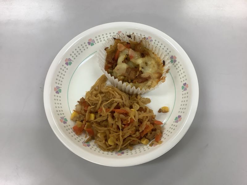 チャプチェとは、春雨を使った韓国の料理です。春雨を肉や野菜と一緒に甘辛く味付けをします。給食では、不足しがちな食物繊維をとれるように、切干し大根を混ぜて作りました。