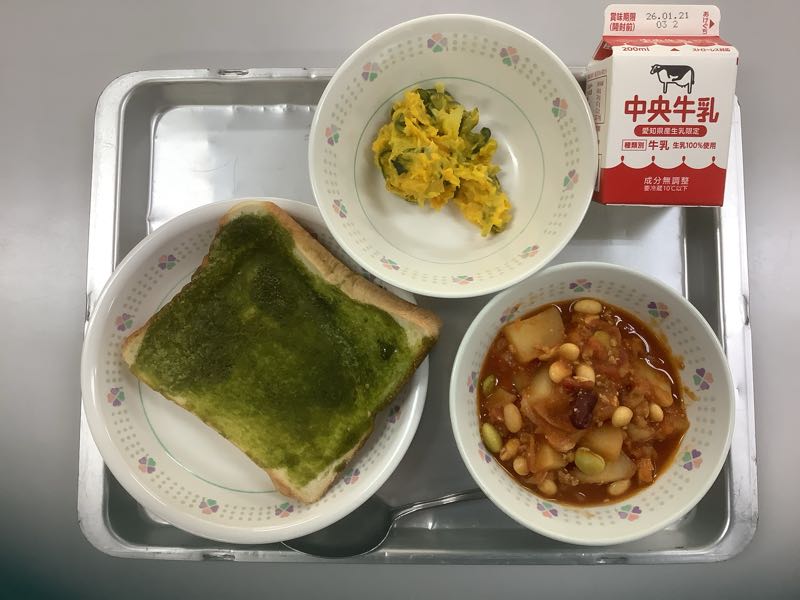 今日のメニューは、抹茶シュガーバタートースト、牛乳、ポークビーンズ、かぼちゃサラダです。(876kcal)
