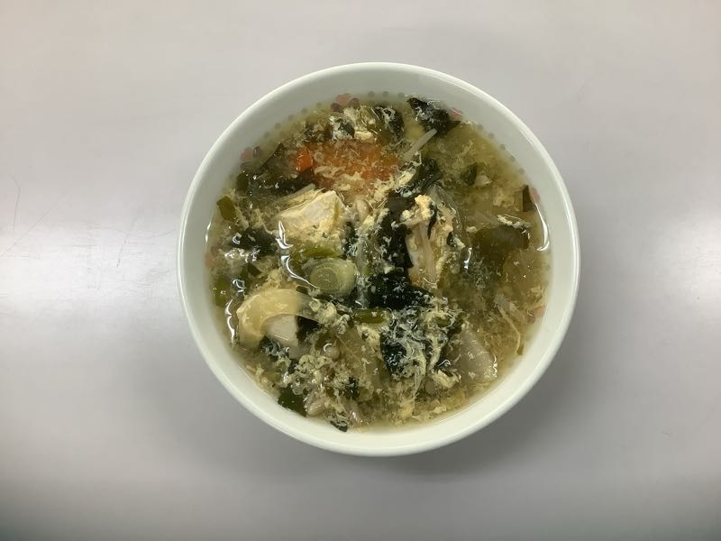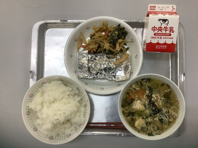 今日のメニューは、ご飯、牛乳、さば銀紙焼き、油揚げと野菜のごまあえ、かきたま汁です。(769kcal)