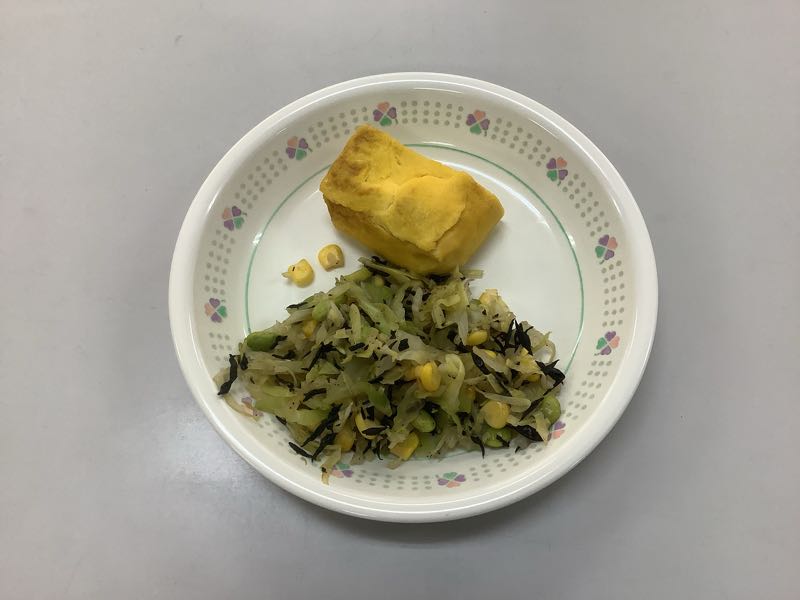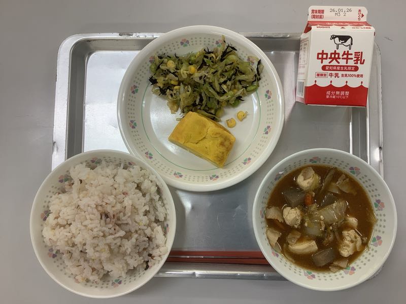 今日のメニューは、五穀ご飯、牛乳、厚焼き卵、しそひじきあえ、豚汁です。(750kcal)