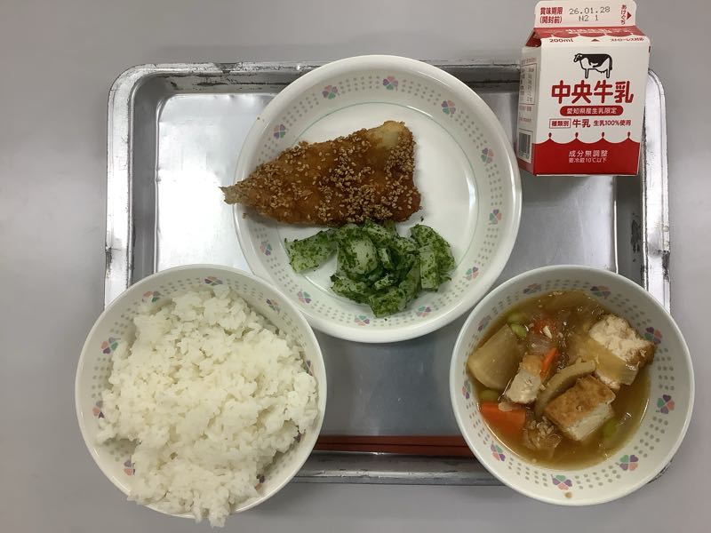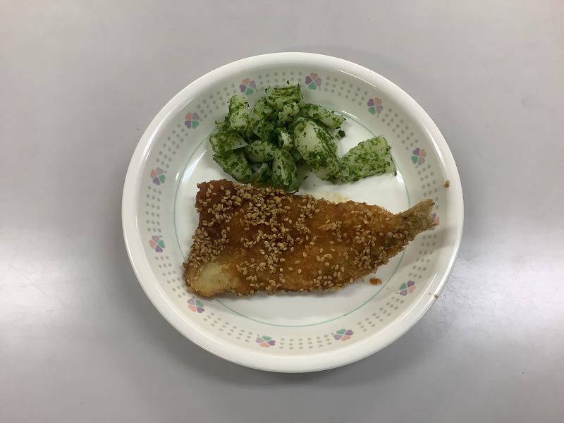今日のメニューは、ご飯、牛乳、ニギスフライのごまたれかけ、磯ポテト、大根のそぼろ煮です。(807kcal)