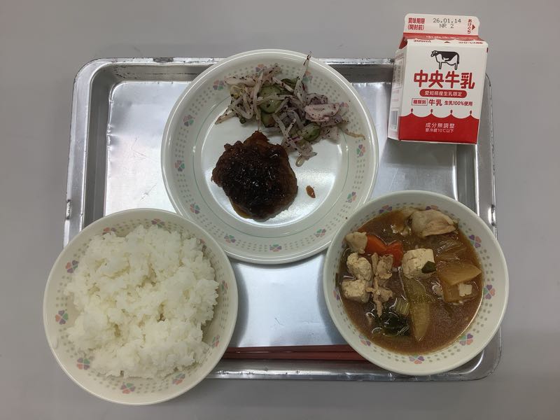 今日のメニューは、ご飯、牛乳、ハンバーグの和風おろしたれかけ、れんこんのしそあえ、かぶ入りみそ汁です。(749kcal)