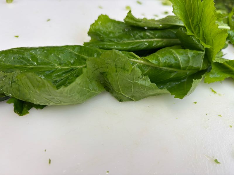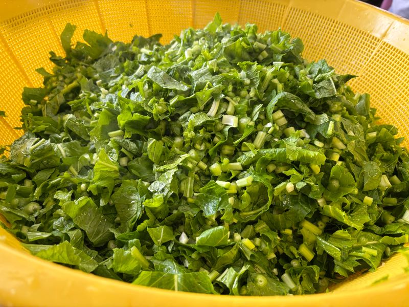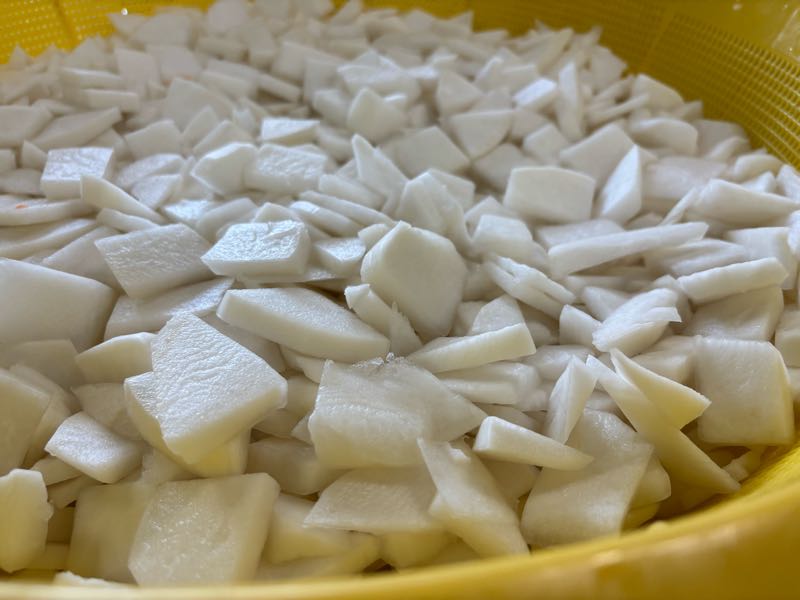給食では、「すずな」をメインにした汁を提供します。この日のために業者さんから、わざわざ葉つきで納品をしてもらっています。