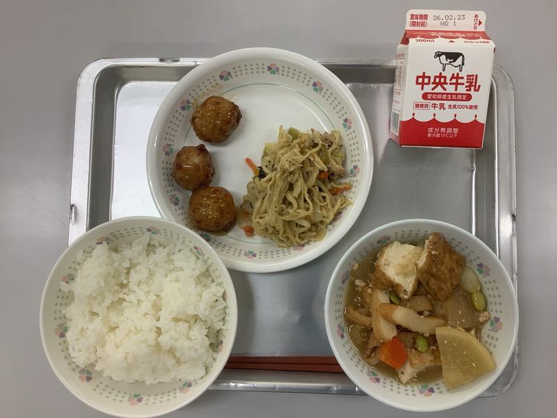 今日のメニューは、ご飯、牛乳、ごぼう入りつくね(3)、豚肉の塩だれ炒め、生揚げのそぼろ煮です。(772kcal)