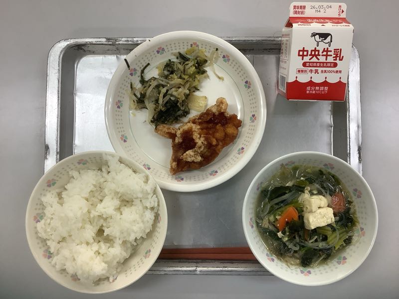 今日のメニューは、ご飯、牛乳、手作りヤンニョムチキン、チョレギサラダ、わかめと春雨のスープです。(819kcal)