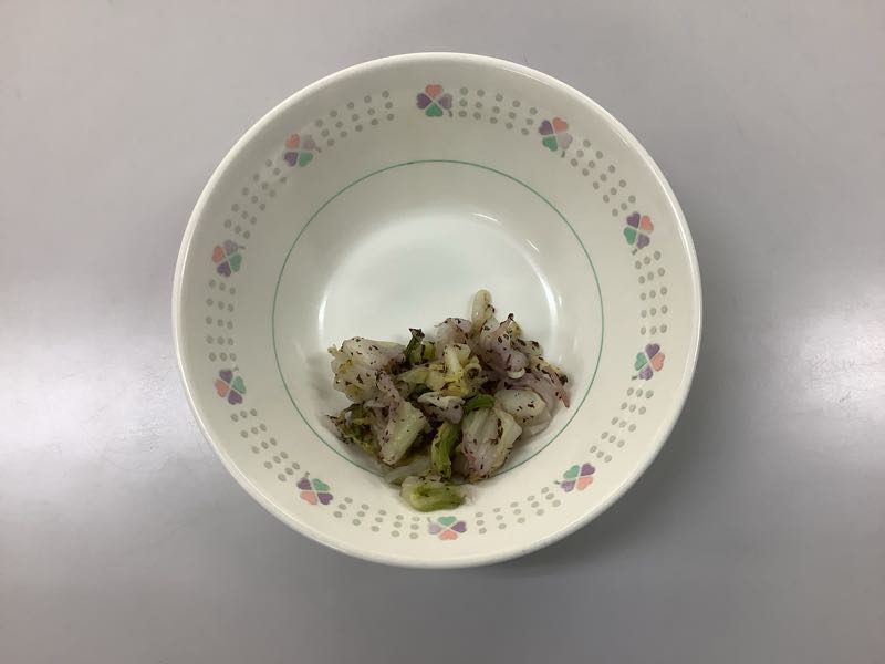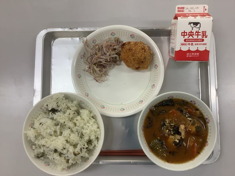 今日のメニューは、わかめご飯、牛乳、手作りさつまいもコロッケ、白菜のしそあえ、大根のみそ汁です。(804kcal)