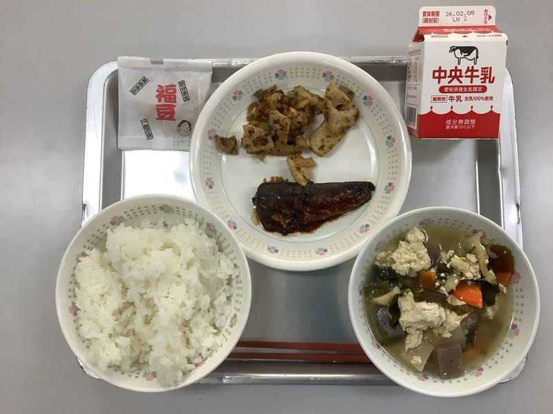 今日のメニューは、ご飯、牛乳、じゃがいもとれんこんの磯がらめ、いわしの八丁みそ煮、かみなり汁、節分豆です。(790kcal) 本日は、節分献立となっています。