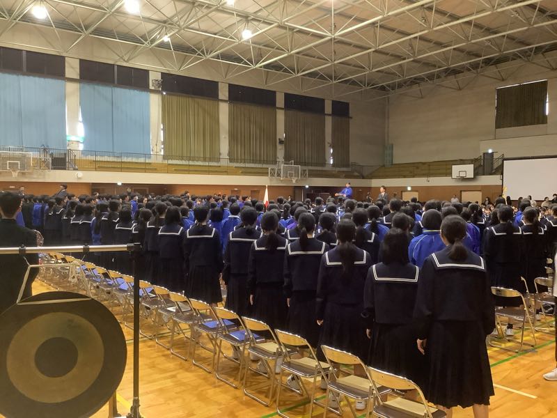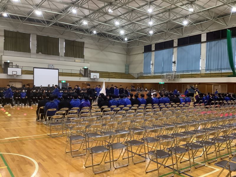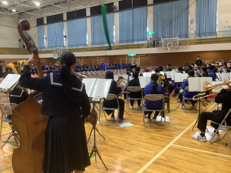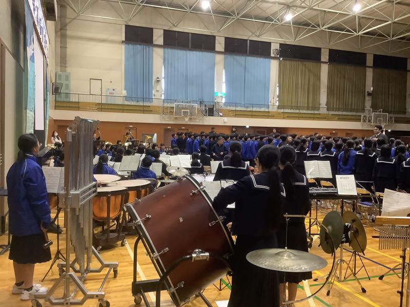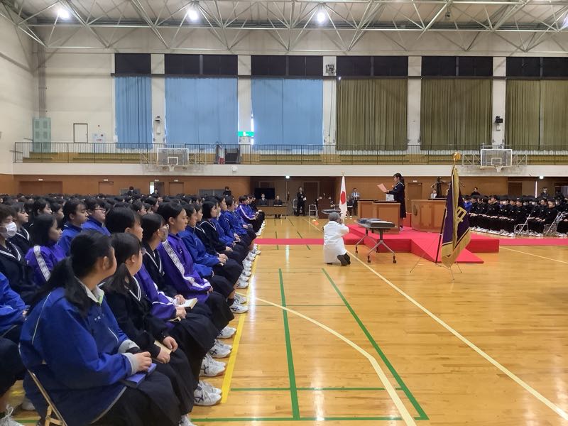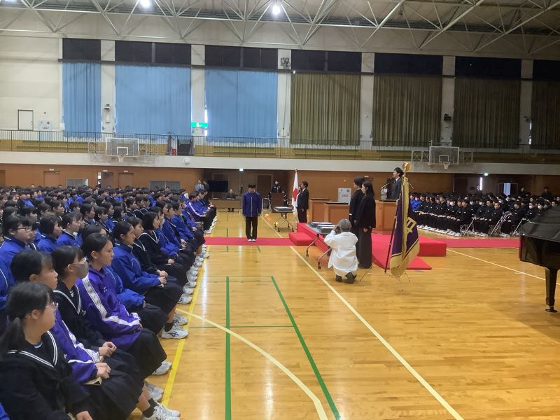 今日の5、6限に卒業式の全校練習をしました。今までは、卒業生と在校生は別々に練習していましたが、初めて合わせの練習となりました。 吹奏楽部の演奏に合わせて、入場をしていきます。