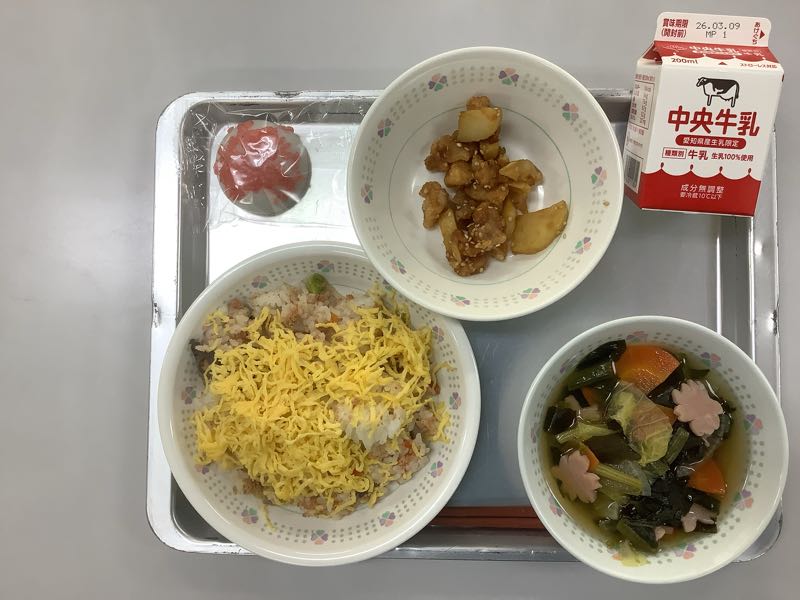 今日のメニューは、五目ちらし寿司、牛乳、鶏唐とじゃがいものからめ煮、桜かまぼこのすまし汁、いがまんじゅうです。(905kcal)