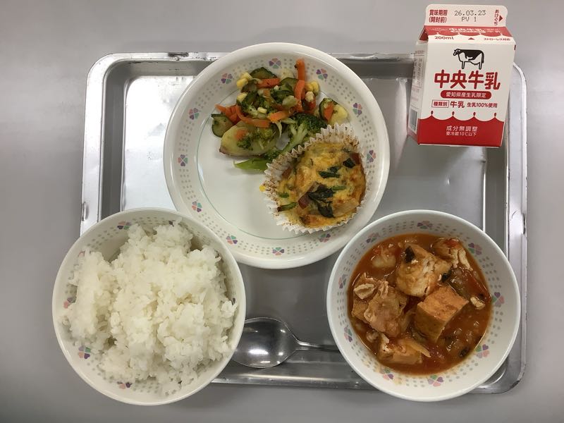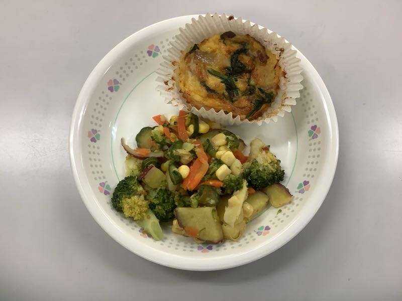今日のメニューは、ご飯、牛乳、手作りほうれん草のキッシュ、さつまいものごまドレサラダ、鶏肉と野菜のトマト煮です。(864kcal)