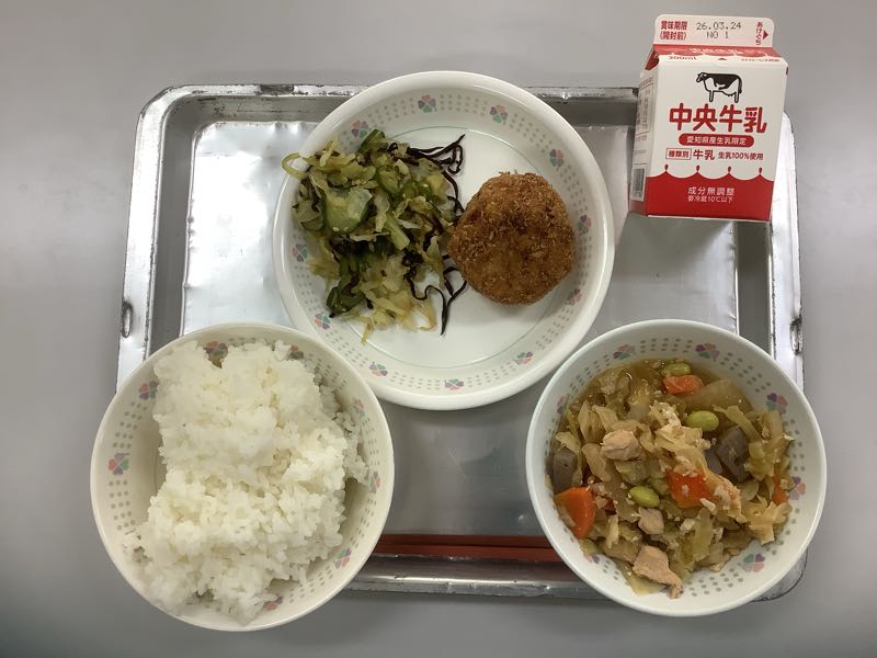 今日のメニューは、ご飯、牛乳、手作り野菜ツナコロッケ、キャベツの昆布あえ、生揚げと野菜のうま煮です。(876kcal)