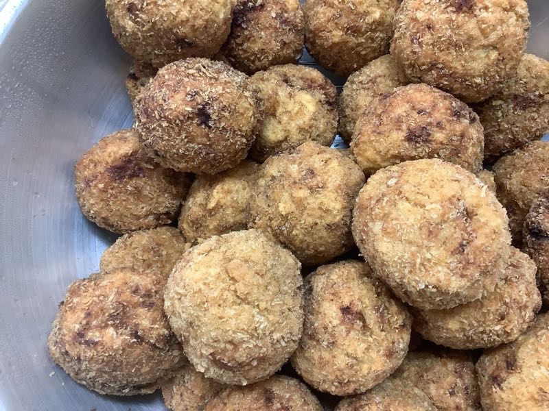 今日のコロッケももちろん調理員さんの手作りですが、今日は動物性の食品を肉類ではなくツナを使って作ります。 ツナのうま味がじゃがいもなどのコロッケのタネにしみておいしいです。