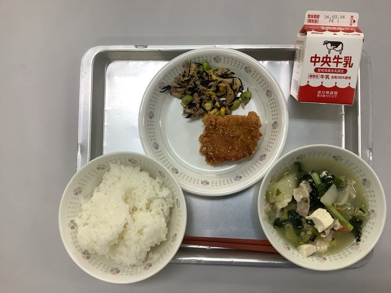 今日のメニューは、ご飯、牛乳、鶏のサクサク唐揚げ、ひじきとツナのマヨ炒め、豚塩ちゃんこです。(877kcal)
