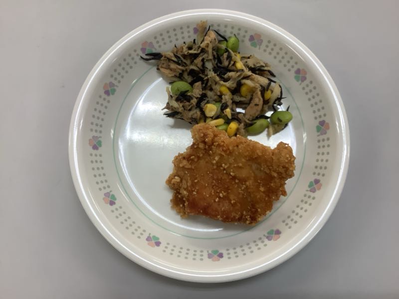 今日の唐揚げは、白玉粉を粒のまま衣にまぶして揚げてみました。ザクザクとした食感になっていたでしょうか? 唐揚げも生徒たちに人気のメニューです。