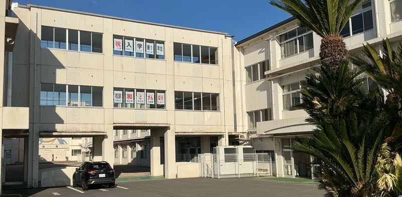令和8年度の入学式・始業式が行われました。校舎の渡りには、新入学のメッセージが飾られています。