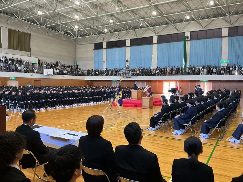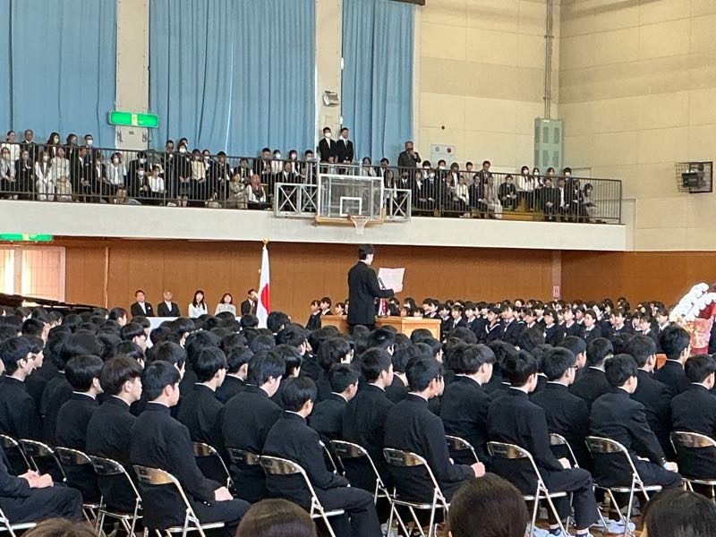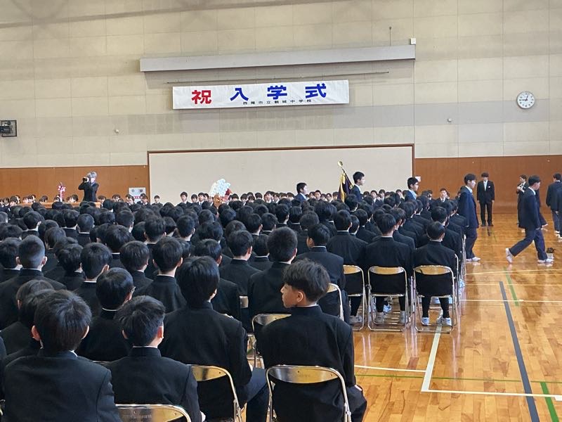 今年度の入学式で大きく変更されたところが、卒業式の会場と同じ、在校生と新入生が向かい合う対面式になったこと。そして、新入生の制服に「ブレザータイプ」が導入されたことで、今までの黒一色から、少し色調が変わったことです。