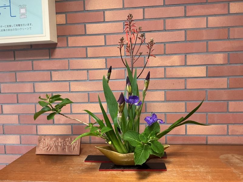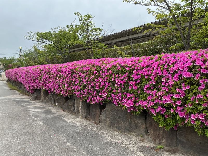 西門付近のツツジが満開です。色鮮やかなピンク色が緑にはえています。