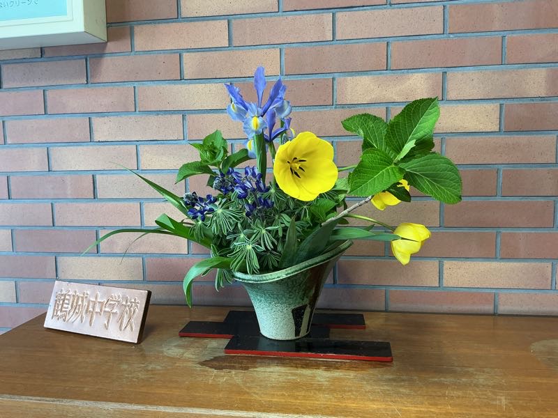 今週の生け花は、チューリップ、ルピナス、アイリス、アジサイの葉、シャガです。