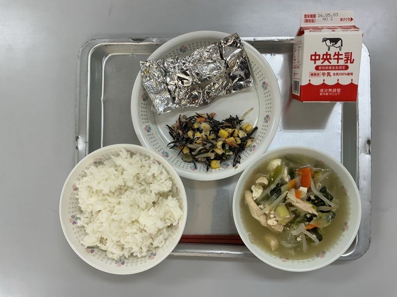 今日のメニューは、ご飯、牛乳、さば銀紙焼き、ひじきのサラダ、鶏塩ちゃんこ汁です。(759kcal)