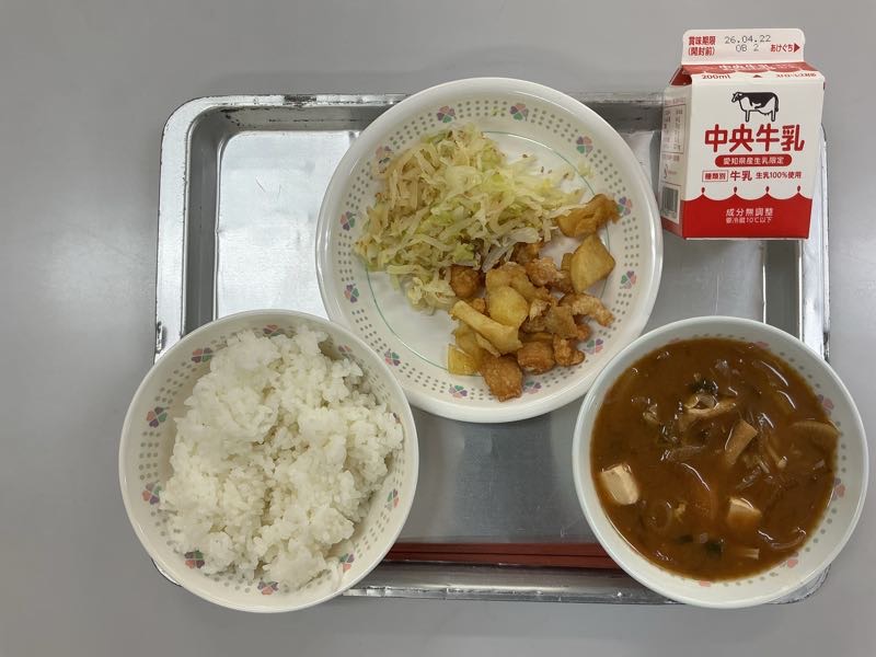 今日のメニューは、ご飯、牛乳、鶏肉とじゃがいものレモン煮、たくあんあえ、新たまねぎのみそ汁です。(836kcal)