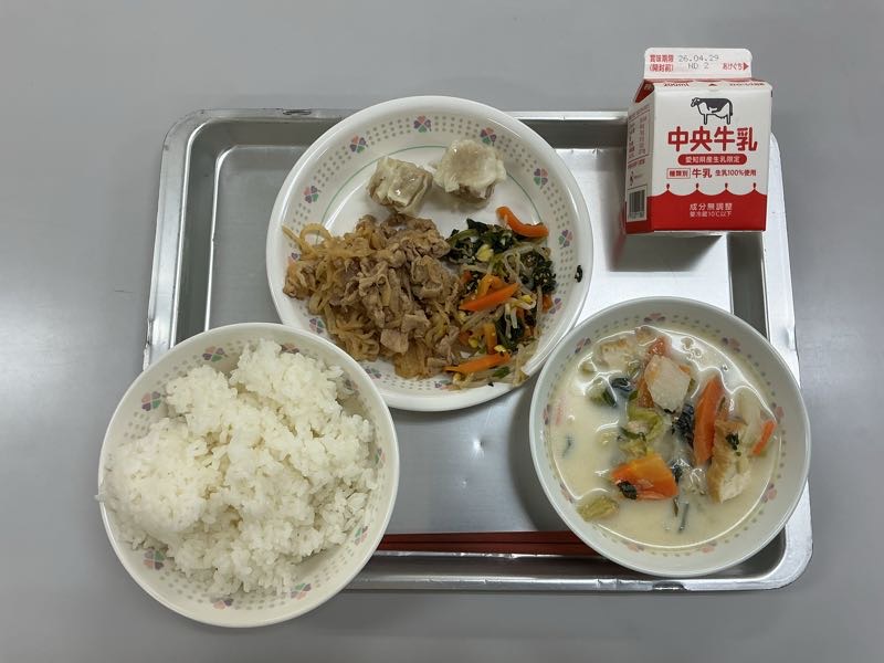 今日のメニューは、ご飯、牛乳、ビビンバの具(肉)、ビビンバの具(野菜)、しゅうまい2個、豆乳中華スープです。(756kcal)