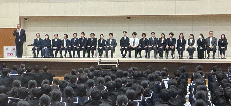 最後に生徒全員で、鶴城中学校の校歌を歌いました。去られる先生方も壇上で聞いています。