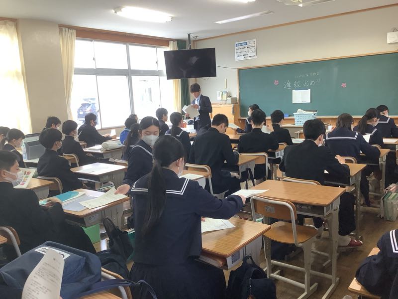 3月22日(金) 本日は修了式後に2年生最後の学活がありました。通知表をもらい喜んでいる生徒や、静かに自分の身の周りの整理をする生徒、担任から最後の学級通信をもらい一年を振り返る生徒など、とてもさまざまなな姿が見られました。 思い返すと、楽しい思い出もたくさんあれば、苦しかった思い出もチラホラ思い出されますね。それでもこの一年間を必死に乗り越えてきた2年生のみんなを尊敬しています。 来年からは「受験」というとても厳しい試練が待っています。しかし、この絆学年で過ごした一年間の姿を見てきた我々教員として、今の2年生ならそんな試練も乗り越えられると確信しています。本当に一年間お疲れ様でした。