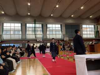 在校生が、けやきロードから正門まで花道をつくり、卒業生歓送会をしました。