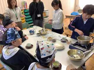 特別支援学級では、家庭科で習ったお茶の出し方を思い出して、お茶を振る舞ったり、茶菓子を作ったりしていました。