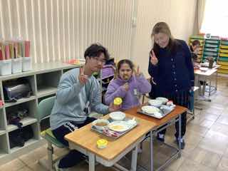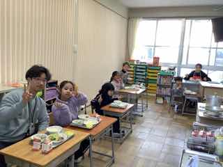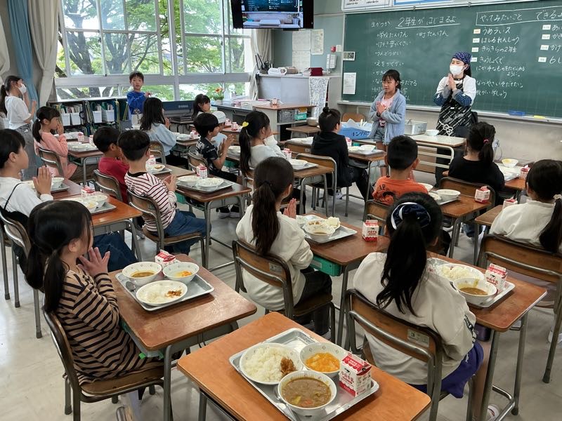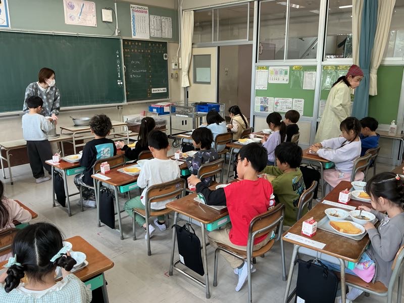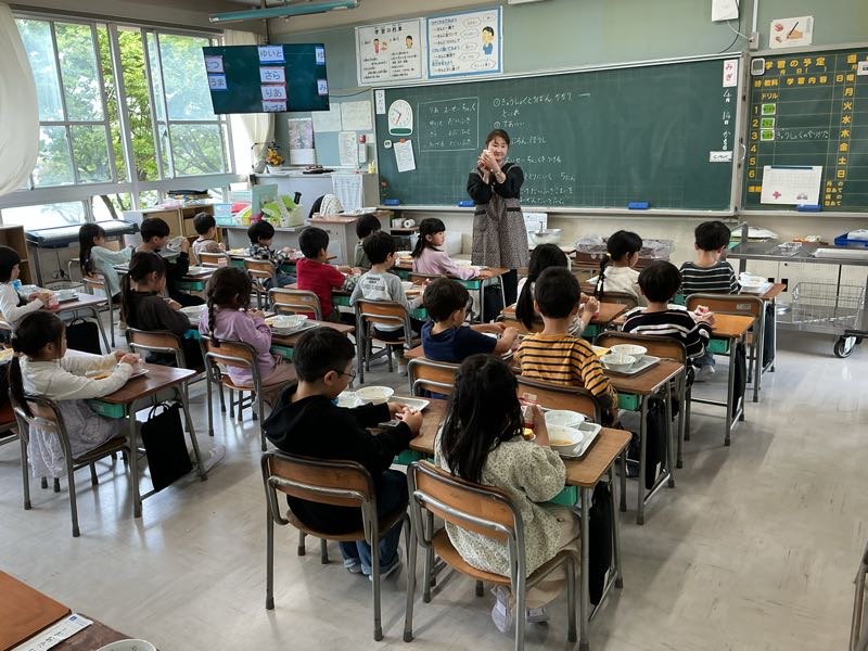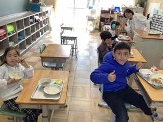 今日は、特別支援学級におじゃましました。静かに準備をしたり、先で待ったりしている子供たち。食べ始めると、みんなニコニコ笑顔になりました。