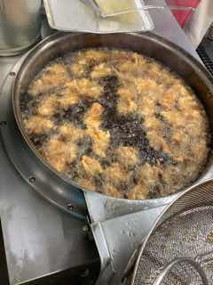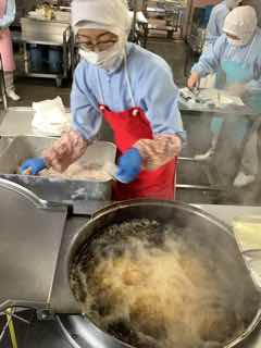 チキン南蛮も、1つ1つ油に入れて、からりと揚げていきます。毎日、およそ740食の給食を作っています。